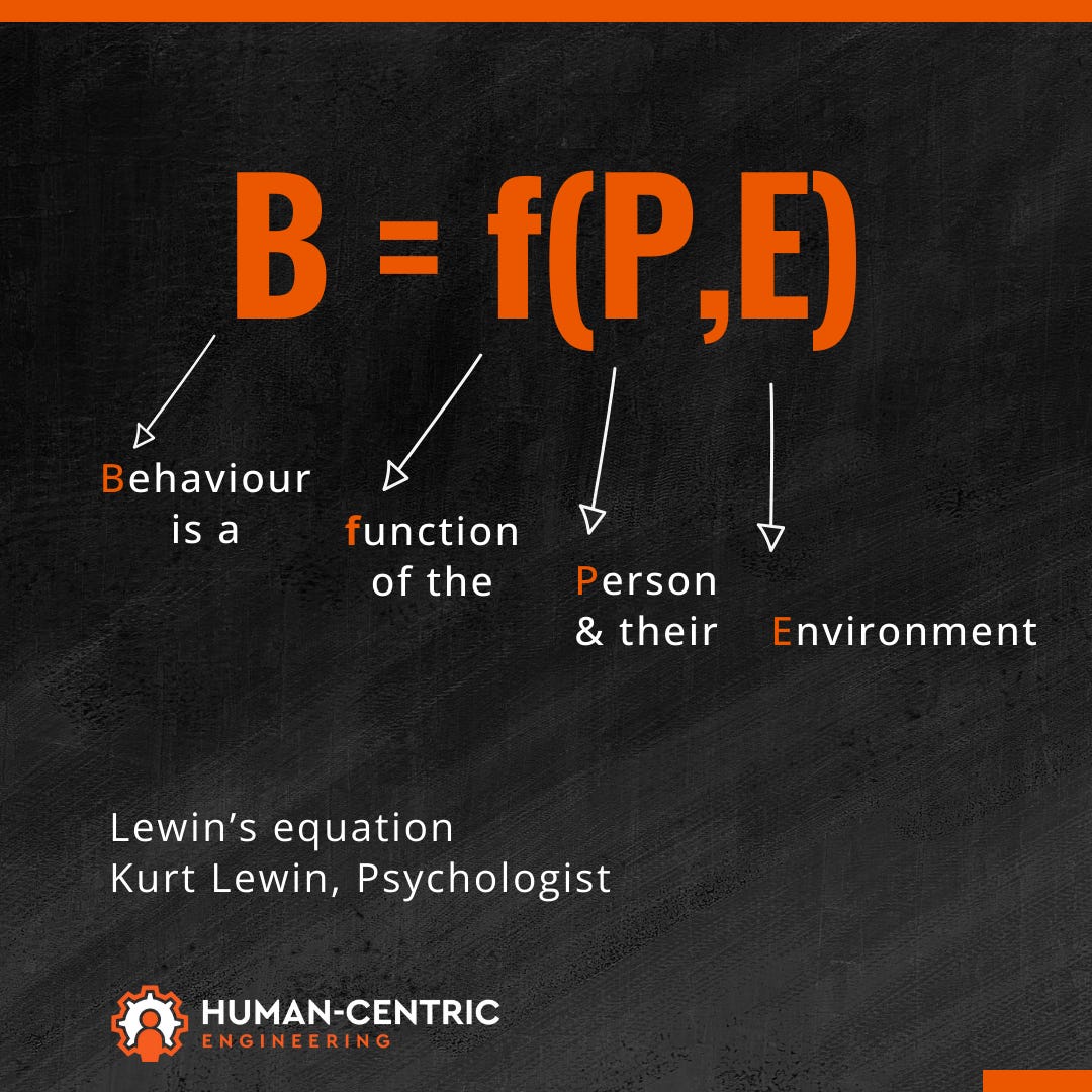 If you are interested, Lewin directly and indirectly inspired a whole breakaway of cognitive science, Ecological Psychology. This unlike traditional cognitive psychology looks to understand the forces at play in the “E” part of Lewins equation whilst not removing the dynamical coupling with “P”.
